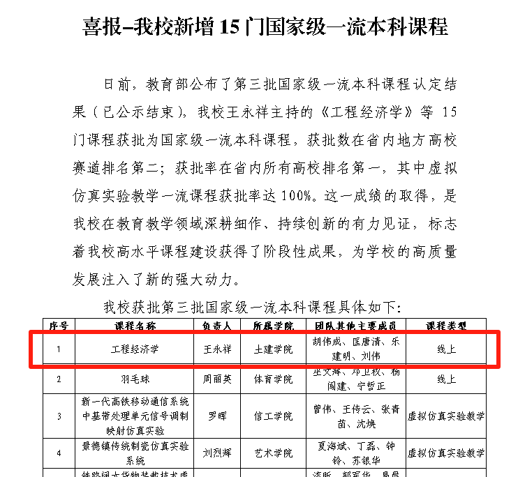 2.培育示范课程:组织教师申报校级“课程思政”示范课程,许开成教授《高等混凝土结构理论》获批立项并获培育资助。王永祥教授主持的《工程经济学》成功获批“国家级一流本科课程(线上)”,为全院课程建设树立标杆。