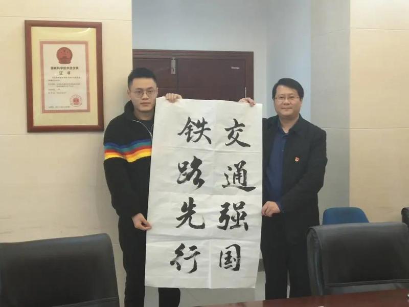 座谈会后,党员江浩宇代表詹天佑班学生党支部党员向张鹏飞老师赠送“交通强国,铁路先行”字画,张鹏飞老师对其大加赞赏。