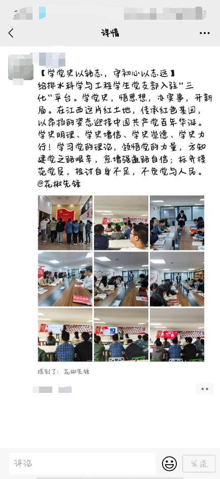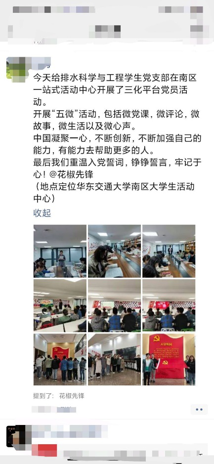 活动结束后,支部每名党员通过微信等新媒体平台,用文字、图片等多种形式,讲述自己的故事,发表自己通过“三化“平台活动的心得和收获。