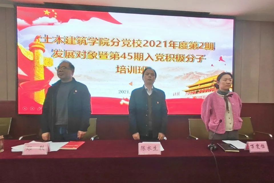 2021年11月25日,土木建筑学院分党校2021年度第2期发展对象暨第45期入党积极分子培训班开班典礼在土建楼200教室举行。出席本次开班典礼的领导老师有:土建学院党委书记、分党校校长陈水生,土建学院党委副书记、分党校副校长郑轶,土建学院党委组织员万雯怡。土建学院本期学生发展对象和入党积极分子、全体学生党员参加本次开班典礼。