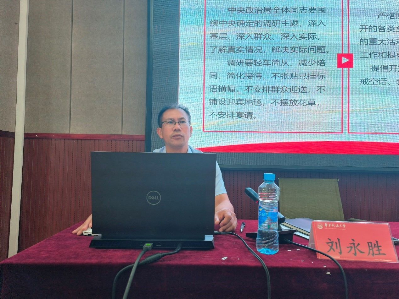 刘永胜以《筑牢纪律防线,践行八项规定》为主题,为毕业生党员们讲授 了一堂发人深省的专题党课。他强调中央八项规定是作风建设的根本遵循和行动号令。他结合习近平总书记率先垂范的实例,要求毕业生党员深刻认识作风建设“永远在路上”的重要性。