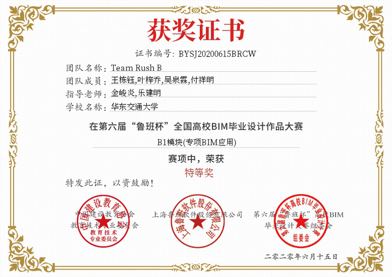 2020年6月13日上午,第六届“鲁班杯”全国高校BIM毕业设计作品大赛正式落幕。华东交通大学共三支代表队,分别取得了特等奖、一等奖和二等奖的成绩。由土木建筑学院金峻炎老师和乐建明老师指导,来自工程管理专业的王栋钰、吴泉霖、付祥明、叶梓乔同学组成的“Team Rush B”团队经过和西南交通大学、中国海洋大学、兰州交通大学、云南大学等200余所高校、近500多支参赛队伍的激烈的比拼角逐,最终获得了本次大赛的特等奖并赢得了价值40000元的软件使用权。