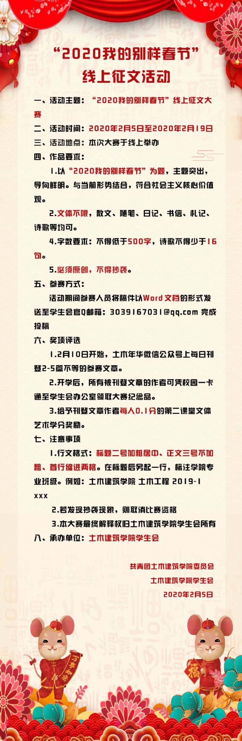 活动期间参赛人员将稿件以Word文档的形式发送至学生会官Q邮箱:3039167031@qq.com.完成投稿