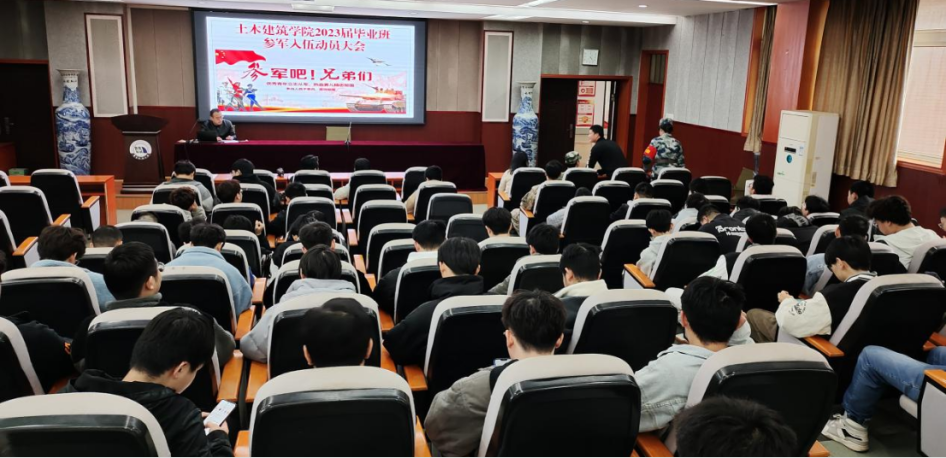 为贯彻落实党中央、中央军委关于国防建设的系列部署,支持国防建设,为军队凝聚优秀人才,我院3月24日在土建楼200会议室组织召开2023届毕业生应征入伍动员大会。参加大会的有土木建筑学院党委副书记郑轶老师、校武装部王聪和王玉军老师、毕业班全体辅导员、毕业生、参军退役复学学生代表等,本次大会由学院征兵联络员陈科楼老师主持。