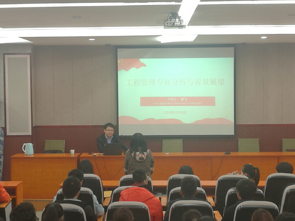 讲座中,秦飞结合自身经历,从行业现状、工作内容、培养要求等方面对工程管理专业前景进行了分析和展望。他指出,工程管理是集工程技术、管理、经济、法律、外语及计算机应用为一体的综合性学科,人才需求量大,专业能力要求高,具有良好的发展前景。他强调,同学们要加强专业知识的学习,逐步提升自身综合能力,成为复合型人才。