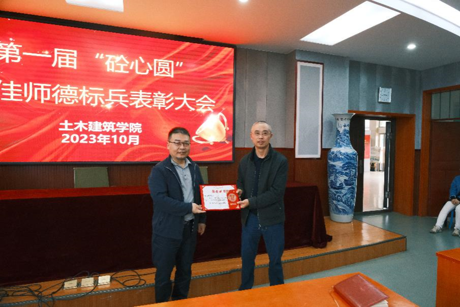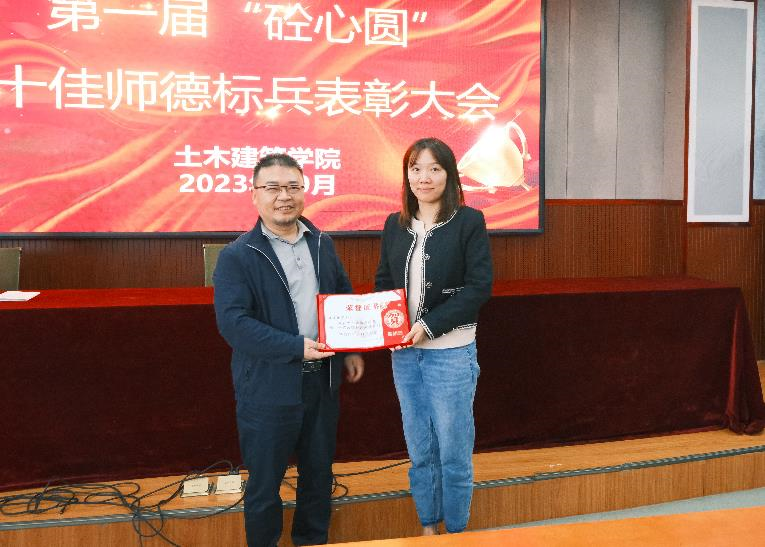 第一届“砼心圆”十佳师德标兵表彰的决定》,王永祥、许开成、麻宏强、万雯怡、程海根、唐朝春、鲁秀国、石钰锋、陈莘莘、李一晖共十位老师荣获土建学院第一届“砼心圆”十佳师德标兵荣誉称号。陈水生书记指出,学院开展师德标兵评选表彰,旨在表扬先进,树立榜样,激励广大教职工员爱岗敬业,涵养高尚师德,潜心立德树人。