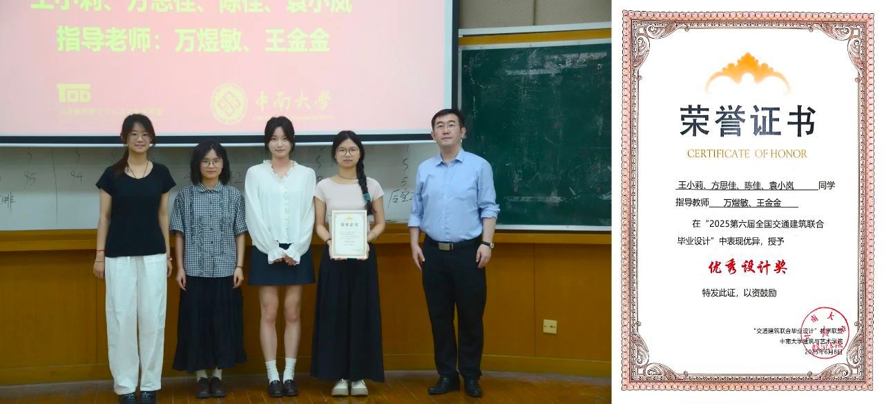 2025年6月8日,为期三个月的“2025年第六届全国交通建筑联合毕业设计”活动在中南大学建筑与艺术学院圆满落下帷幕。十大交通院校师生齐聚星城,我院建筑学专业师生团队在麻宏强副院长和李晨教授的带队下,赴长沙参加了此次联合毕业设计终期答辩,并荣获“优秀设计奖”。当日还进行了成果交流与学习互动!