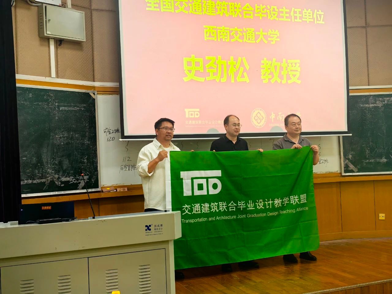 在全国交通建筑联合毕设主任单位西南交通大学史劲松教授的主持下,本届主办方中南大学建筑与艺术学院解明镜副院长将象征着责任与梦想的联合毕设旗帜,郑重交予下届主办方代表——华东交通大学土木建筑学院麻宏强副院长手中。这一刻,接力棒正式传递,2026年的舞台属于华东交大!