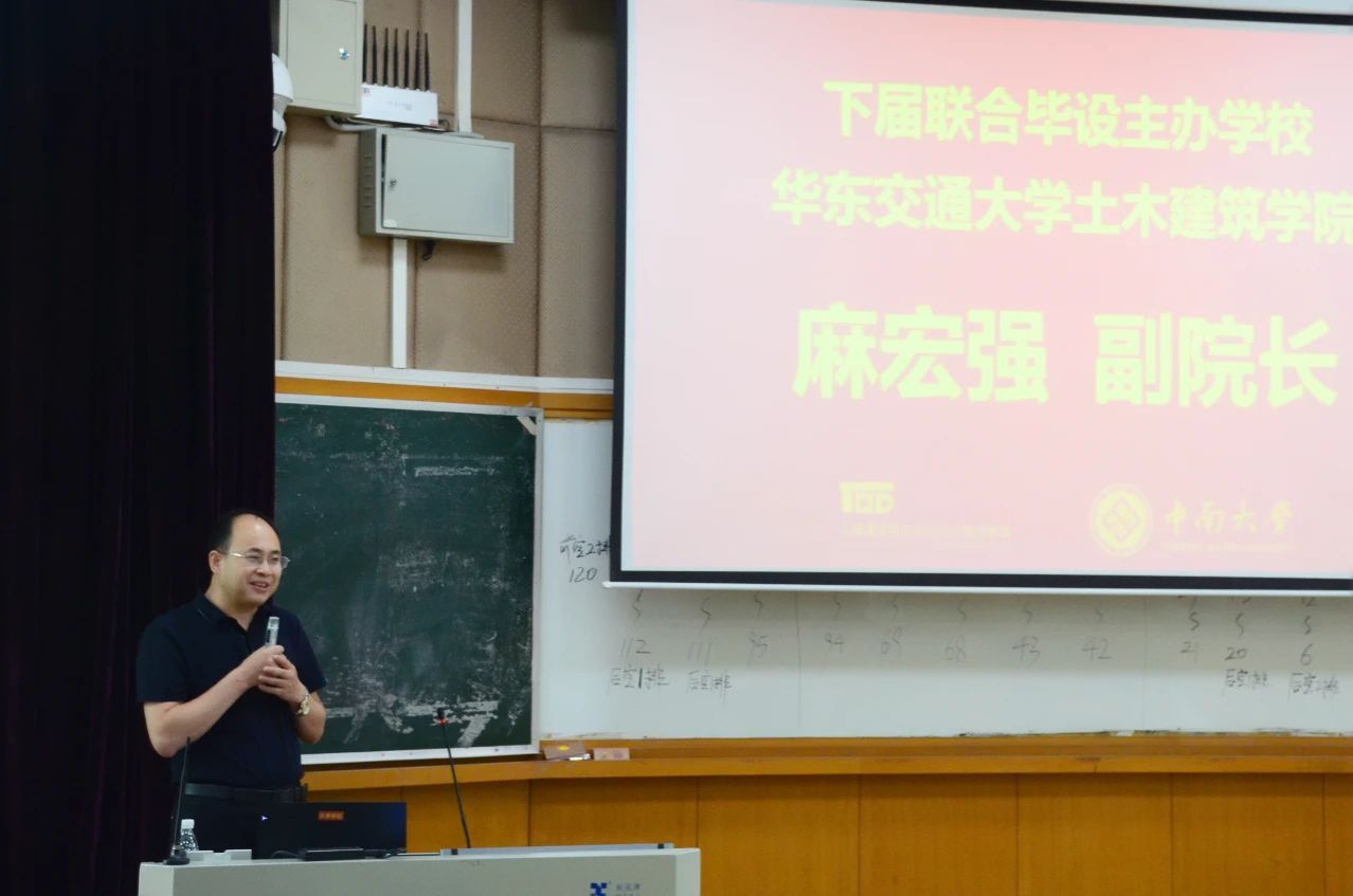 麻宏强副院长在接过旗帜后发表了热情洋溢的讲话。他首先衷心感谢中南大学的出色组织与各兄弟院校的信任支持,郑重承诺华东交通大学土木建筑学院必将不负重托、承前启后,以最大的热忱、周密的筹划、创新的思维,全力办好2026第七届全国交通建筑联合毕业设计,为全国交通建筑学子打造一个更具活力、更富成效、更显价值的学习与交流平台!