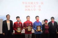 华东交通大学校长罗玉峰宣布本届华东地区高校结构设计邀请赛获奖名单:福州大学二队获得特等奖,华东交通大学一队、福州大学一队、河海大学一队获得一等奖,华东交通大学二队、华侨大学一队、华侨大学二队、河海大学二队、中国矿业大学一队、合肥工业大学二队、合肥工业大学一队获得二等奖,青岛理工大学二队、中国矿业大学二队、青岛理工大学一队、东南大学一队、南京航空航天大学一队、南昌大学一队、山东大学一队、南昌大学二队、南昌工业大学一队、东南大学二队、南京航空航天大学二队获得三等奖