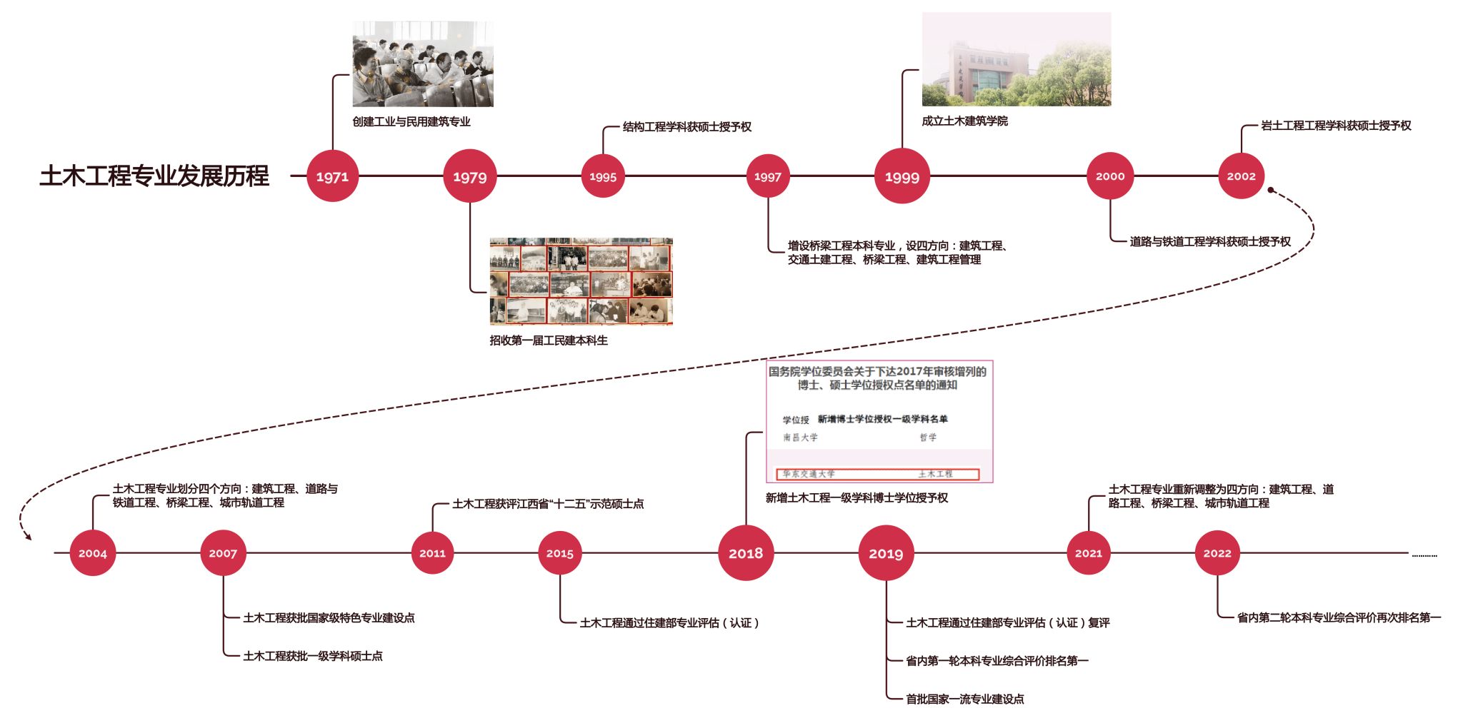 土木工程专业以交通土建为特色,是我校办学时间最长、教学资源配置最齐全、师资力量最雄厚、社会认可程度最高的专业之一。专业发展历程如下: