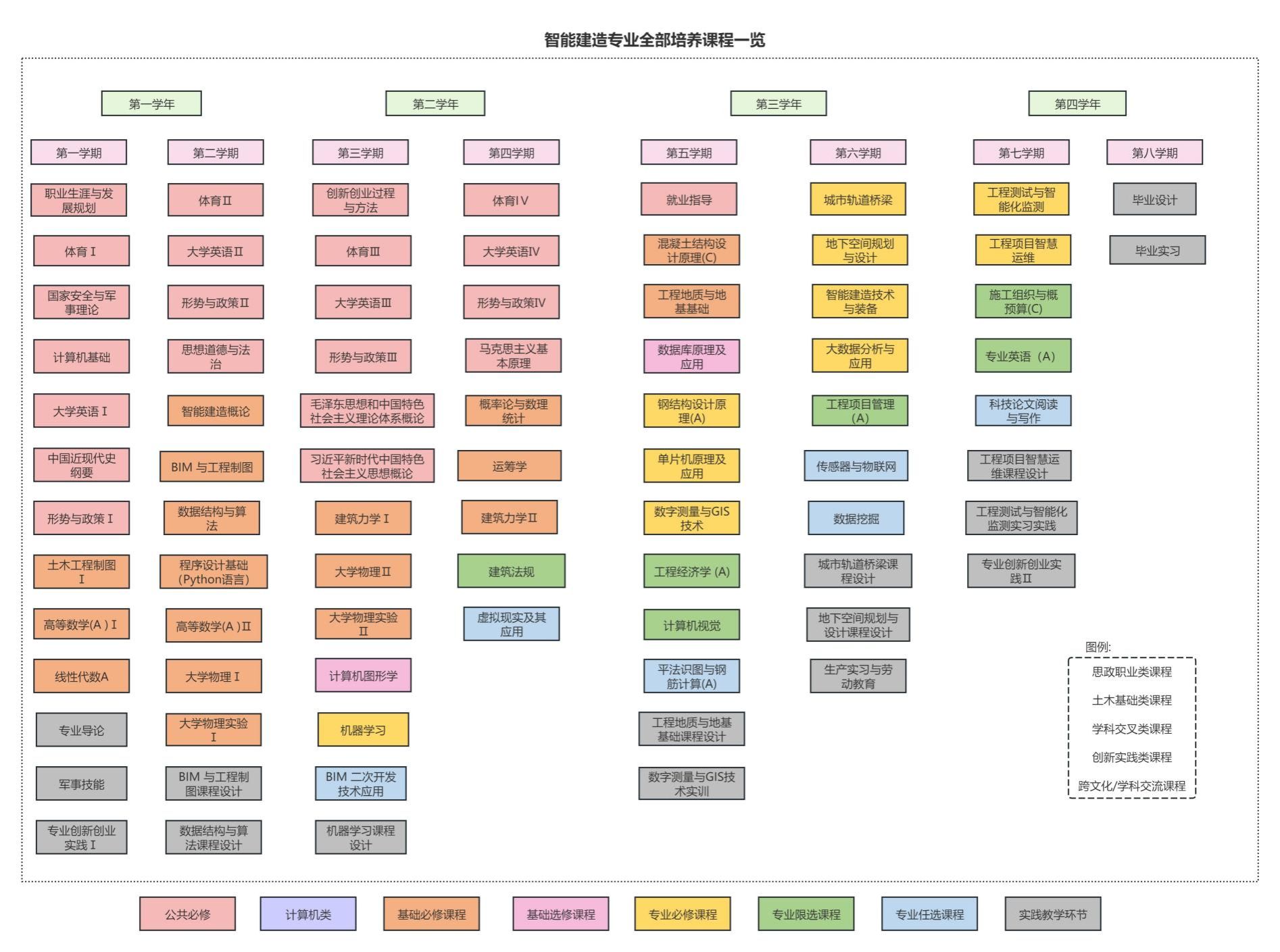 混凝土结构设计原理、智能建造概论、BIM与工程制图、工程地质与地基基础、运筹学、建筑力学、数据结构与算法、计算机图形学、数据库原理及应用、城市轨道桥梁、地下空间规划与设计、工程测试与智能化监测、智能建造技术与装备、工程项目智慧运维、钢结构设计原理、机器学习、单片机原理及应用、数字测量与GIS技术、大数据分析与应用、计算机视觉。