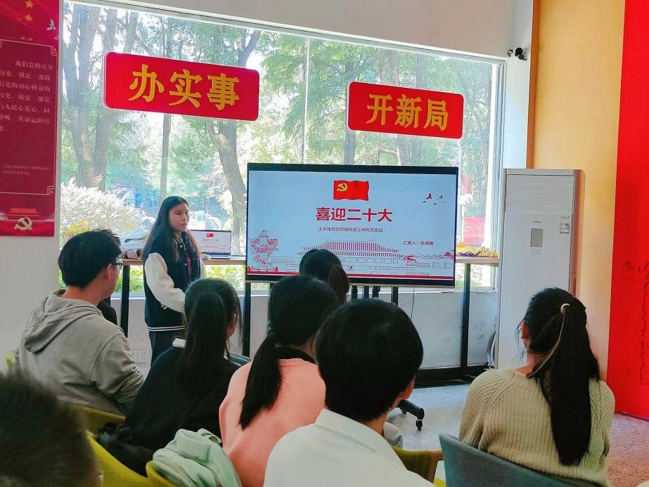 土木建筑学院建筑管工供热研究生党支部于大学生活动中心展开了支部主题党日活动,活动的主题是:学习中国共产党第二十次全国代表大会精神。整个活动分为四个部分,分别是:重温入党誓词,党员讲微党课,时事讨论以及观影《领航》。