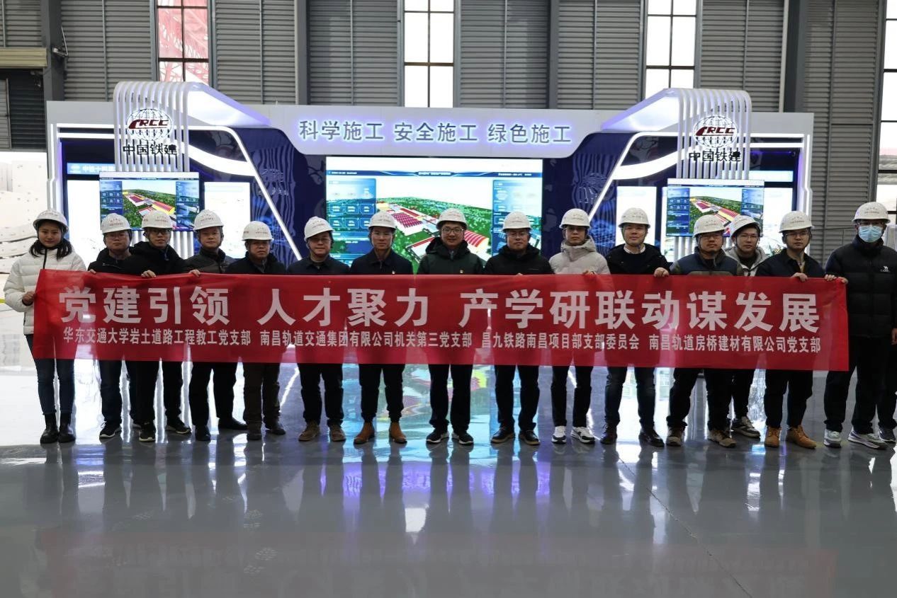 为全面贯彻落实习近平总书记考察江西重要讲话精神,推动校企党建联建共建落实落地,不断推进“产学研”深层次合作,以党建引领科研工作提质增效。近日,岩土道路工程教工党支部书记雷祖祥同志带队,前往中铁十四局集团有限公司昌九铁路7标项目经理部二分部开展党建引领,人才聚力,产学研联动谋发展活动,参加本次活动还有蒋亚龙同志、石钰锋同志及杨超同志。南昌轨道交通集团有限公司机关第三党支部支部书记、合约部部长曹鹏飞同志、技术部副部长张慧鹏同志,昌九铁路南昌项目部党支部支部书记魏海净同志、总经理张学栋同志;南昌轨道房桥建材有限公司党支部书记、总经理刘巍同志,董事长张振波同志等二十余人参加了交流活动。