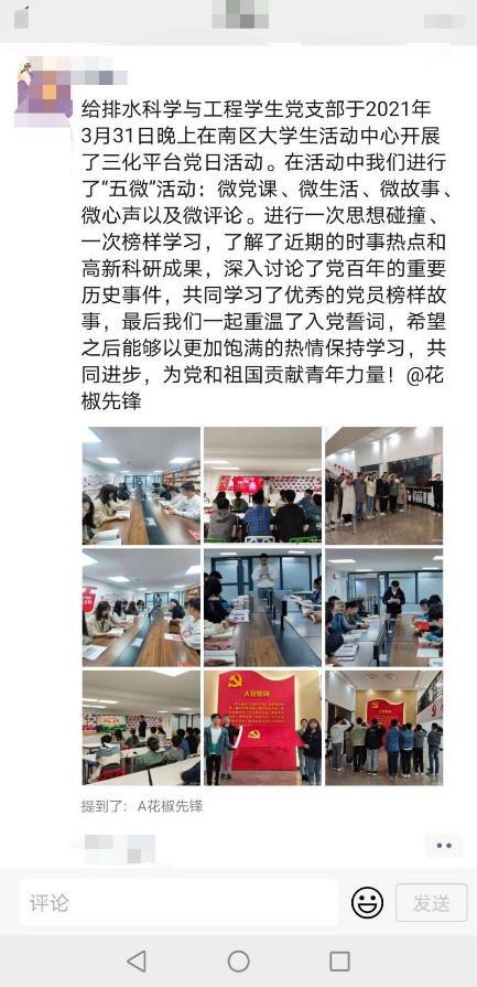 奋斗百年路,启航新征程。通过此次“三化”平台活动和“五微“内容的开展,给排水科学与工程学生党支部全体党员对党史、党章、党的精神有了更深入的了解。用党的奋斗历程和伟大成就鼓舞斗志、明确方向,用党的光荣传统和优良作风坚定信念、凝聚力量,用党的实践创造和历史经验启迪智慧、砥砺品格。以更加昂扬姿态奋力开启全面建设社会主义现代化国家新征程,以优异成绩迎接建党一百周年。