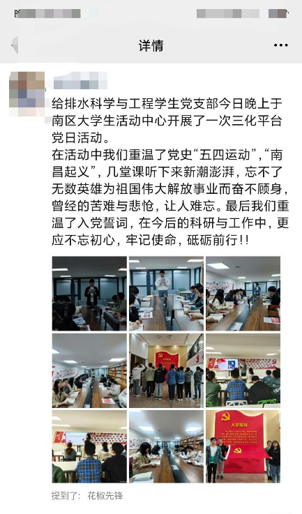 给排水科学与工程党支部组织各党员寻找党史和身边的优秀党员事迹,通过讲党员故事等方式学习先进典型重温榜样力量,用好榜样“活教材”传承榜样力量。
