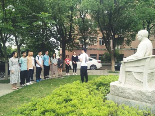 所以活动开始,大家在杨耀乾教授雕塑前进行了入党宣誓并学习杨教授的精神,“我志愿加入中国共产党,拥护党的纲领,遵守党的章程,履行党员义务,执行党的决定,严守党的纪律,保守党的秘密,对党忠诚,积极工作,为共产主义奋斗终生,随时准备为党和人民牺牲一切,永不叛党。”表达了对“五四”精神的传承。
