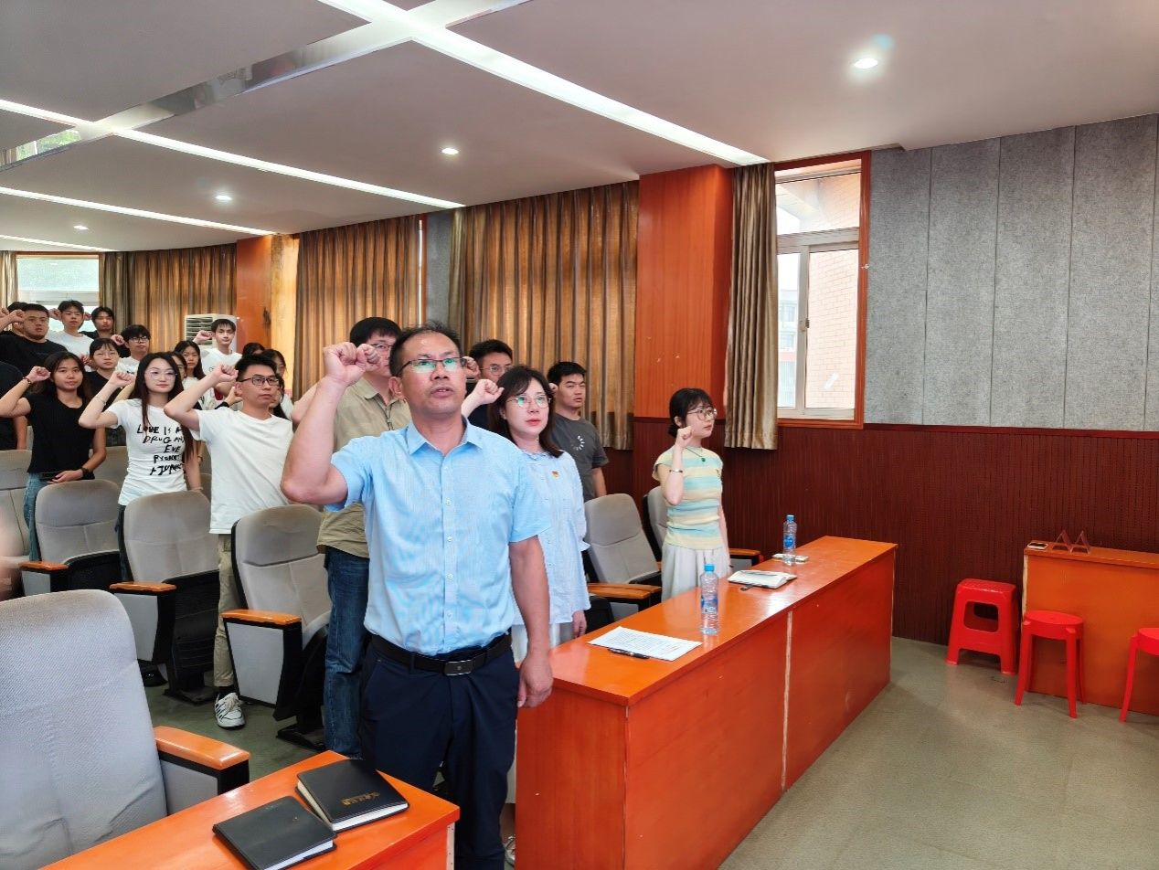 在刘永胜带领下,全体毕业生党员高举右拳,面向党旗重温了入党誓词。