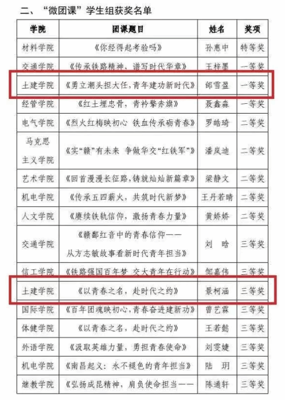 近日,学校公布2025年“微团课”大赛结果,我院参赛师生凭借扎实的理论功底、生动的课程设计和昂扬的青春风采,斩获一等奖1项、二等奖1项、三等奖3项。学院团委获“优秀组织奖”,万雯怡获“优秀指导教师”。充分展现了学院在大学生思政教育和团员青年思想引领等工作的成效。