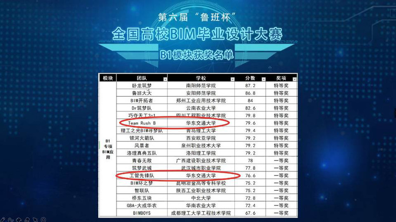 2020年6月13日上午,第六届“鲁班杯”全国高校BIM毕业设计作品大赛正式落幕。华东交通大学共三支代表队,分别取得了特等奖、一等奖和二等奖的成绩。由土木建筑学院金峻炎老师和乐建明老师指导,来自工程管理专业的王栋钰、吴泉霖、付祥明、叶梓乔同学组成的“Team Rush B”团队经过和西南交通大学、中国海洋大学、兰州交通大学、云南大学等200余所高校、近500多支参赛队伍的激烈的比拼角逐,最终获得了本次大赛的特等奖并赢得了价值40000元的软件使用权。