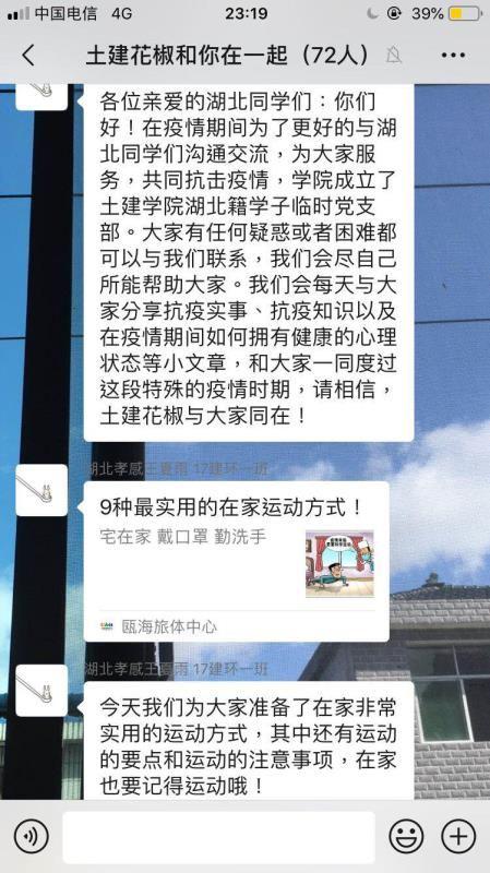 为响应国家体育总局《关于大力推广居家科学健身方法的通知》,积极倡导居家科学健身方式,助力打赢疫情防控阻击战。土木建筑学院通过湖北籍学生临时党支部,引导湖北籍学生在家锻炼,坚持打卡。