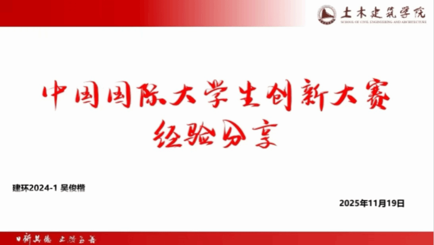 为积极推动双创教育,引导大学生在双创竞赛中提升自我,近日,我院在教九栋200会议室举办 “筑创大讲堂” 竞赛分享会,学院兼职团委副书记严安迪老师主持,中国国际大学生创新大赛(2025)总决赛国铜获奖团队负责人吴俊楷、第十九届“挑战杯”全国大学生课外学术科技作品竞赛国二获奖团队负责人张允担任主讲嘉宾,分享国赛夺奖经验、备赛历程与核心秘籍。