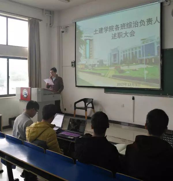 会议中,土建学院各班级综治负责人上台做述职报告。报告中提到17测绘以班会的形式进行安全防治工作;16詹天佑自发组织早读,按规定进行晚自习,以及自己策划活动;17土木四班采用各班委担任寝室长的方式将管理落实到个人等多种班级综治方式。