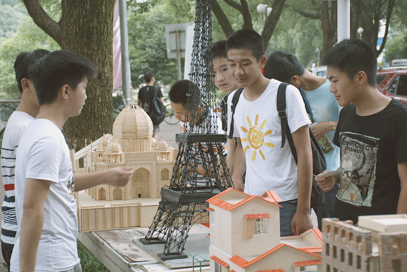 在土建学院的帐篷前,建模大赛获奖作品吸引了同学们的注意力,他们围拢在展示台前观看模型,进行咨询。土建学院志愿者们耐心解释每一个模型的制作材料、拼接过程和展示意义等等。