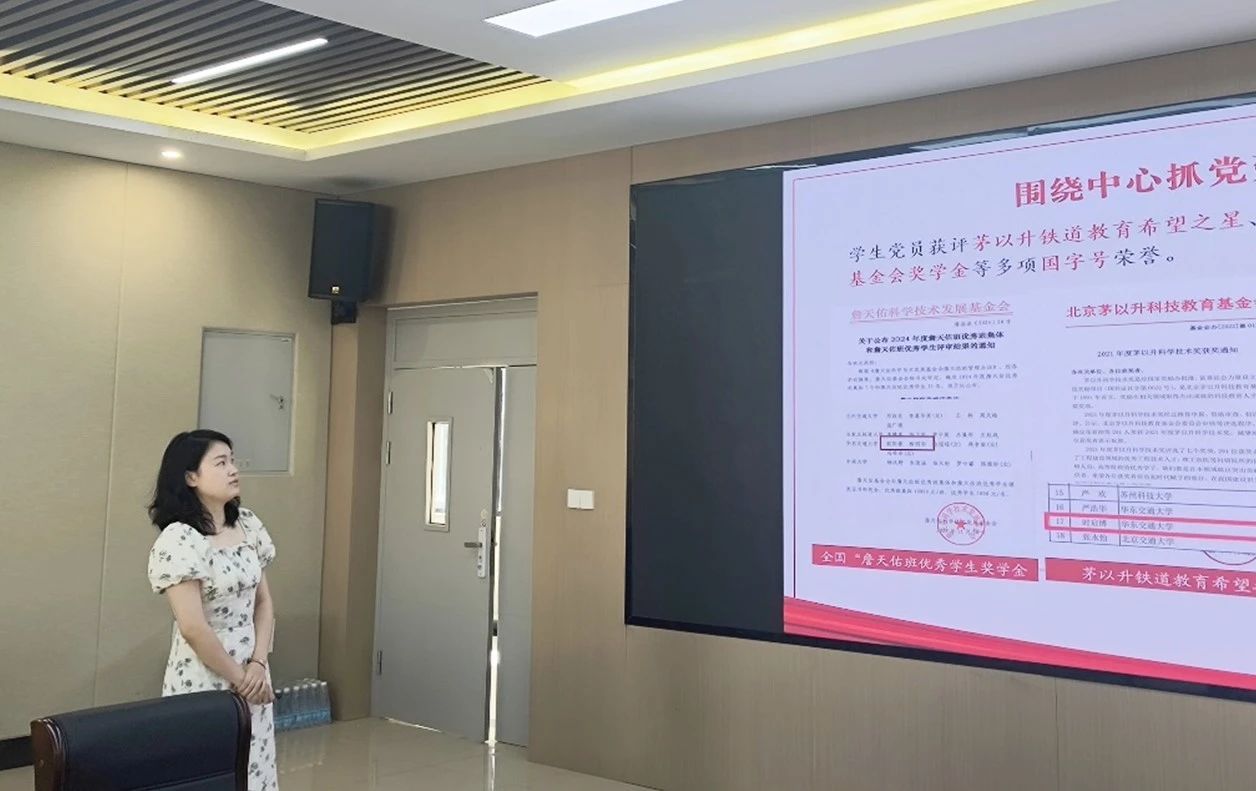 随后,詹天佑班学生党支部书记贺慧文以《实践中做示范,共建中创品牌》为主题介绍了学生样板支部创建的经验做法,围绕“党建引领”、“党建赋能”、“党建共建”、“党建融合”四个方面生动展现了党支部建设的具体成效。
