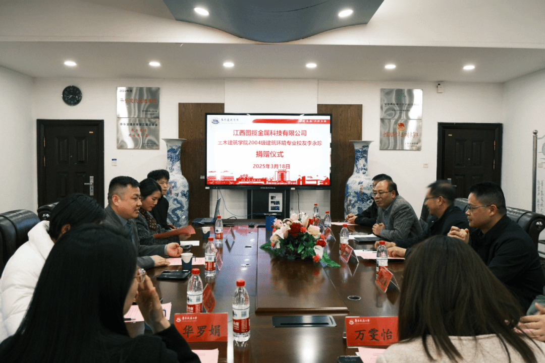3月18日下午,土建学院在教9栋302会议室举行校友捐赠仪式,江西图揽金属科技有限公司总经理李永珍(我院2004级建环专业校友)、综合部经理宋利娟、销售部经理邓梦云,学院党委书记刘永胜,学校校友办公室副主任、对外联络处副处长吴亮秦,学院能源与人工环境系主任康慧伦、学工办主任兼团委书记万雯怡、学工办副主任、团委副书记、校友联络负责人华罗娟、兼职团委副书记严安迪出席仪式,仪式由学院党委副书记郑轶主持。