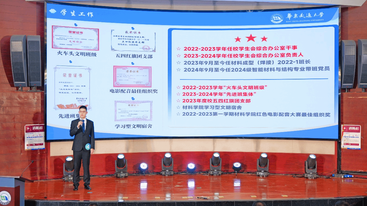 星河璀璨,青春当燃。本次评选分为研究生组和本科生组,21位候选人按照抽签顺序依次上台,通过视频展示、风采展示、选题作答三个环节依次进行个人展示。他们中有学术科研的佼佼者,有志愿服务的践行者,有创新创业的开拓者,也有艺术体育的追梦者。他们的精彩表现是华交学子弘扬“火车头”精神、争做“新铁军”的充分展示,赢得了阵阵掌声。