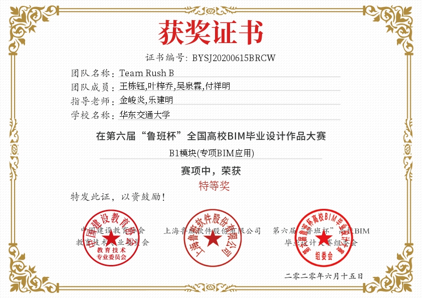2020年6月13日上午,第六届“鲁班杯”全国高校BIM毕业设计作品大赛正式落幕。由土木建筑学院金峻炎和乐建明老师指导,来自工程管理专业的王栋钰、吴泉霖、付祥明、叶梓乔同学组成的“Team Rush B”团队经过和西南交通大学、中国海洋大学、兰州交通大学、云南大学等200余所高校、近500多支参赛队伍的激烈的比拼角逐,最终获得了本次大赛的特等奖,并赢得了价值40000元的软件使用权。