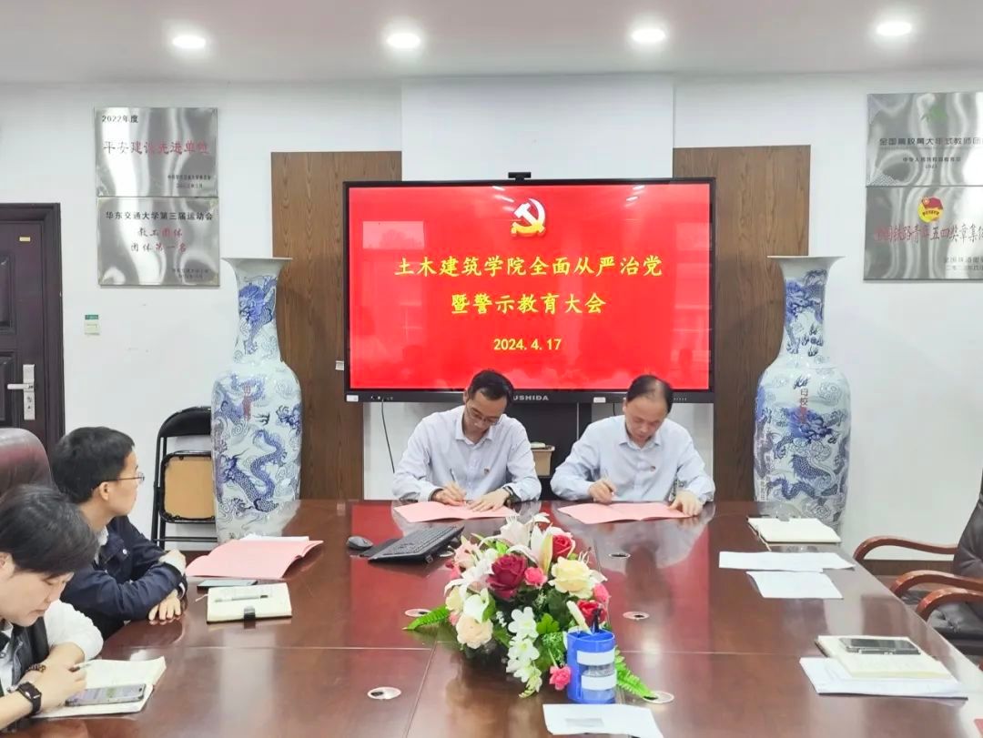 院党委书记陈水生与党支部书记代表李晨、万雯怡签订了意识形态责任书,随后,他与院长庄海洋同系部主任代表伍海山、冯玉林签订了全面从严治党责任书。