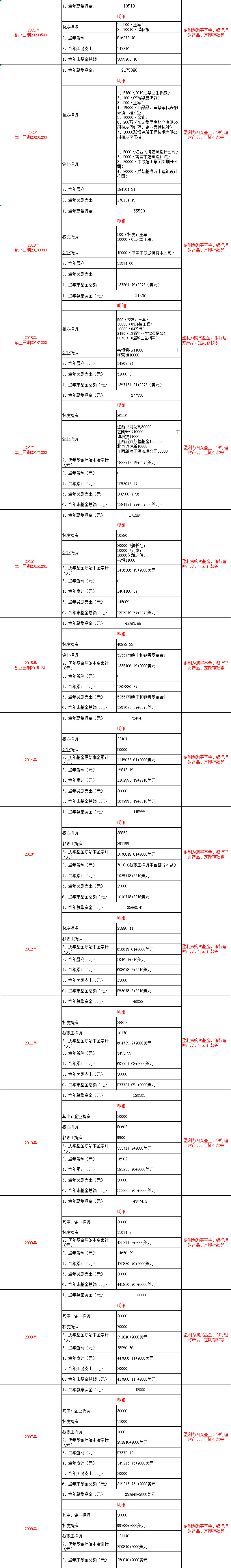 说明: 1、历年基金原始本金累计指:基金会所募集到的基金总和,等于历年募集资金的总和; 2、当年盈利指:银行定期存款到期或购买理财产品赎回后的盈利,没有包括末到期的存款和末赎回理财产品可能发生的盈利。